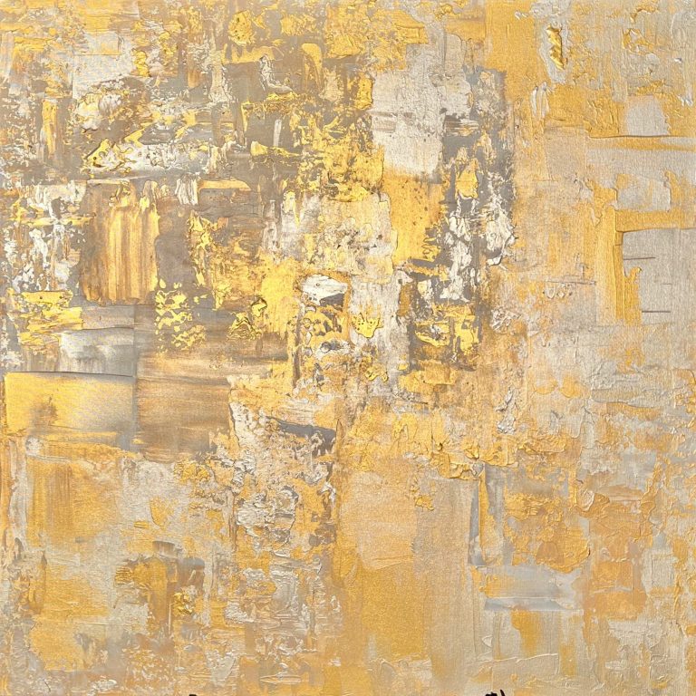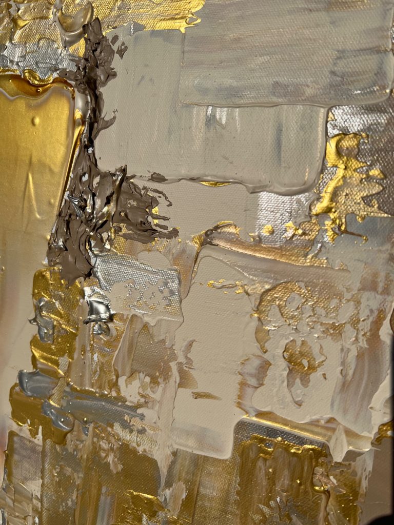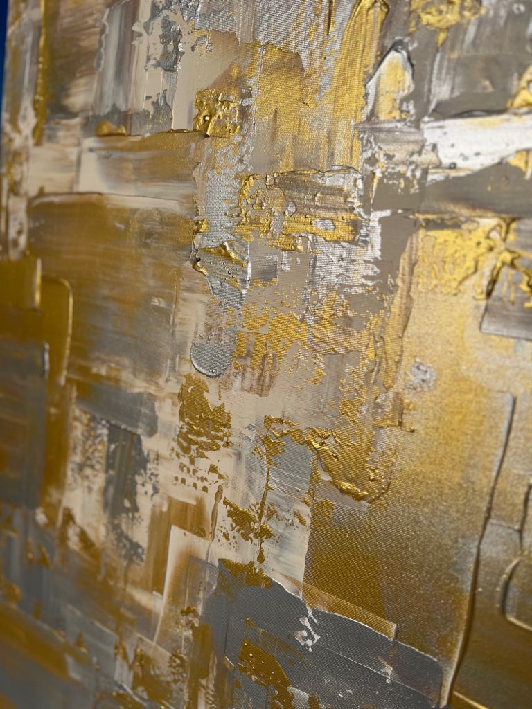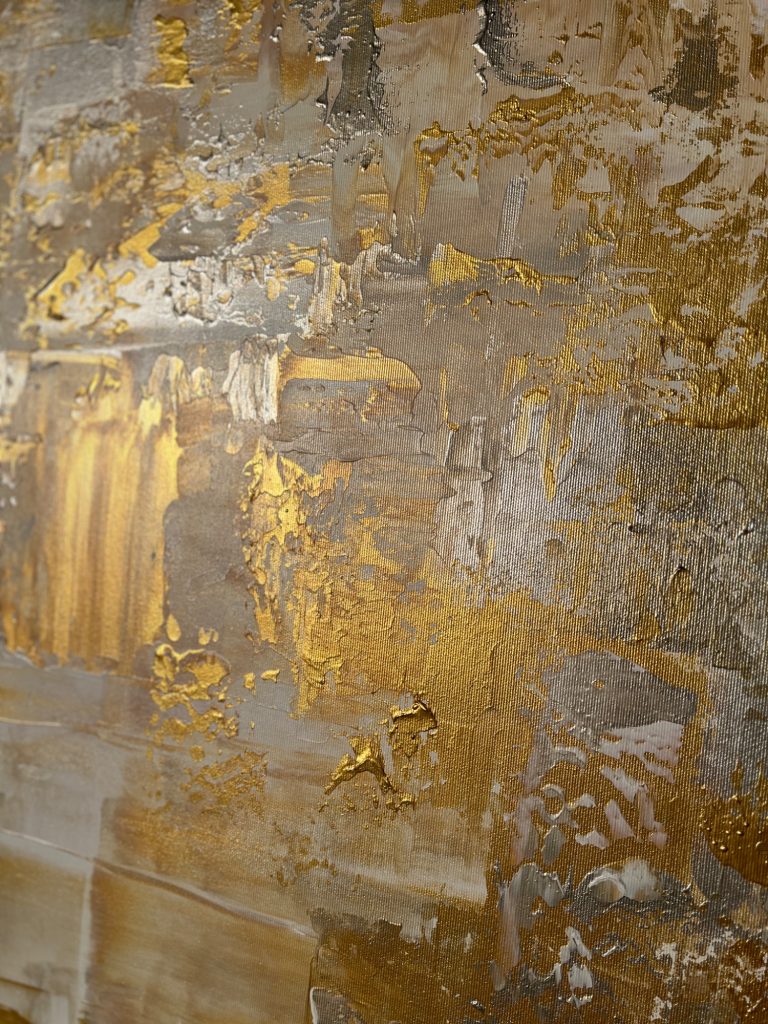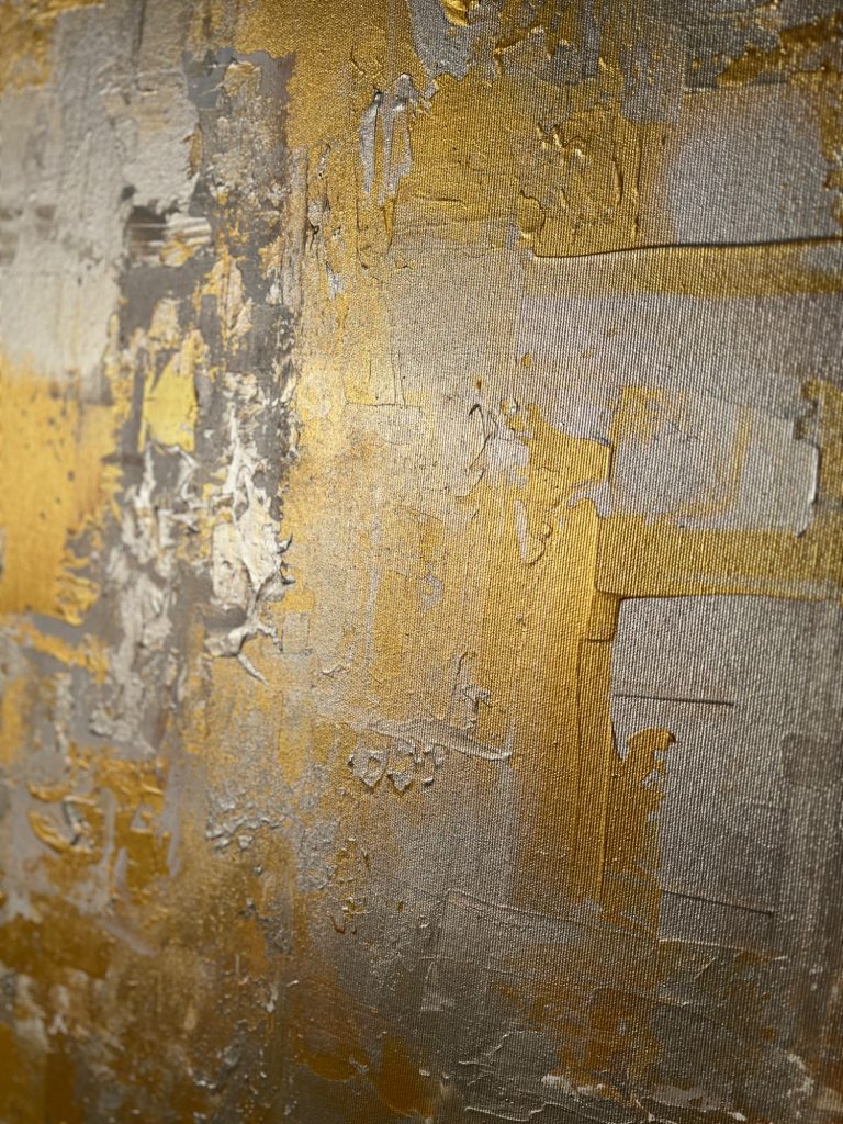 In diesem zeitgenössischen Werk habe ich die zeitlose Schönheit von Gold und Silber eingefangen – es strahlt Wärme und Eleganz aus, als ob es eine Geschichte aus vergangener Zeit erzählt. Gerade die unterschiedlichen Bereiche des Bildes lassen es besonders wirken. Mittig habe ich es großflächig und clean angeordnet, seitlich kam meine spezielle Technik zum tragen, welche es wieder etwas auflockert.