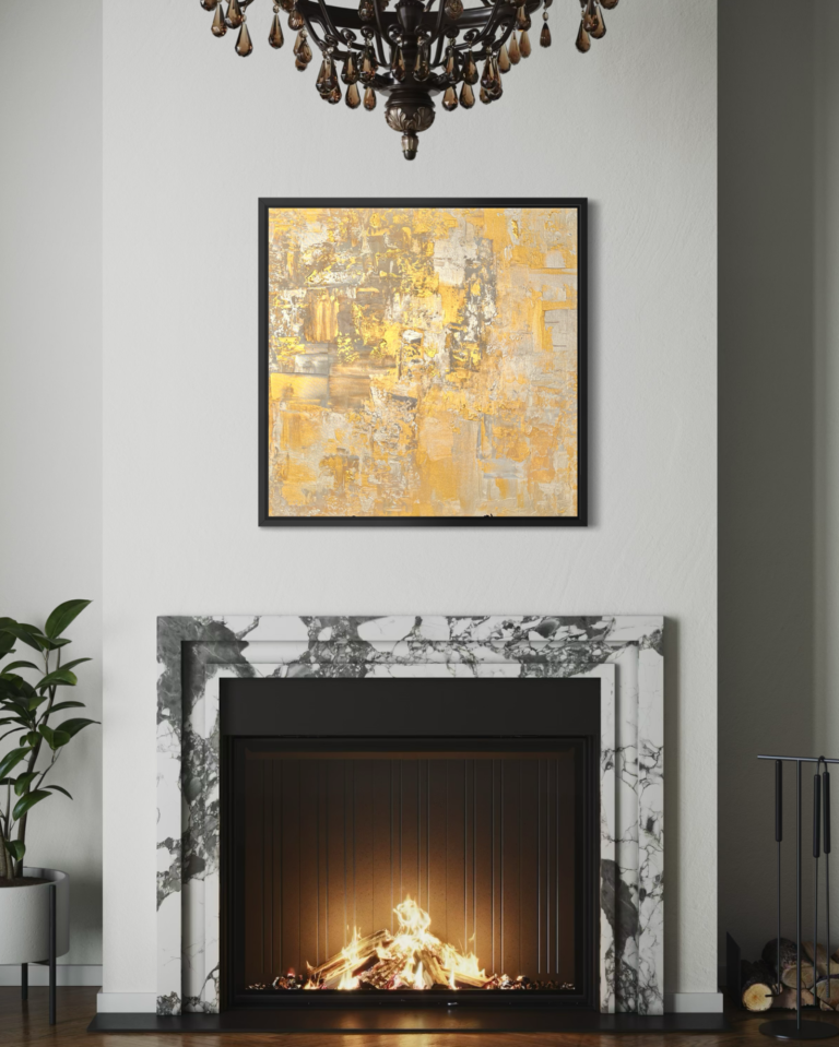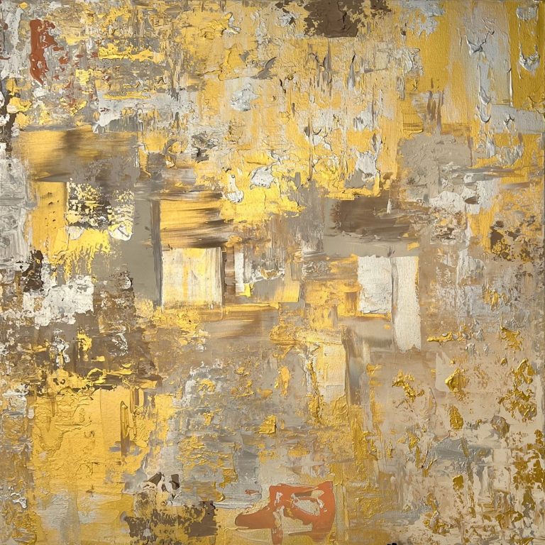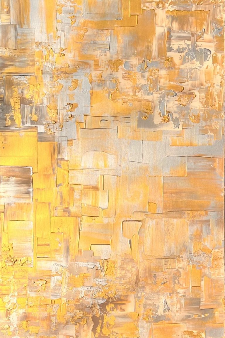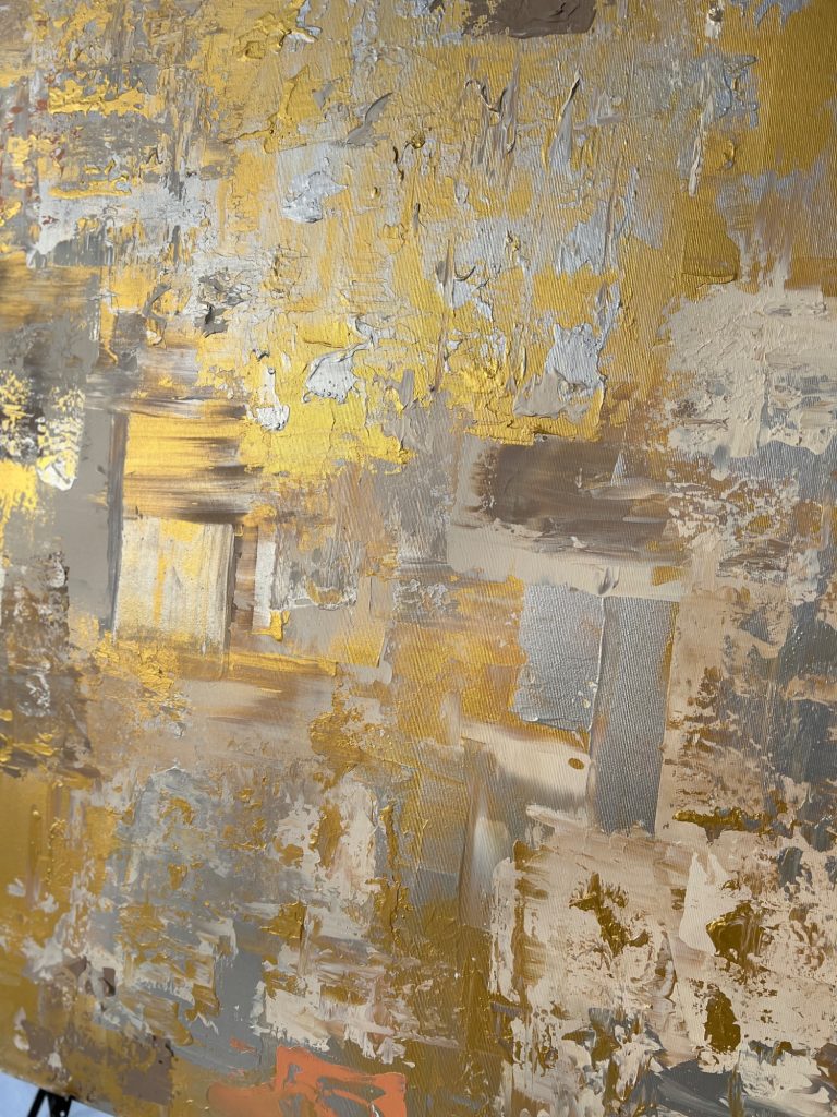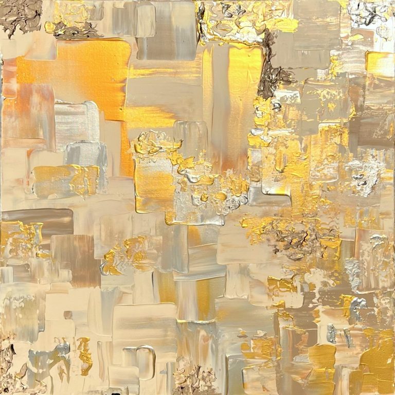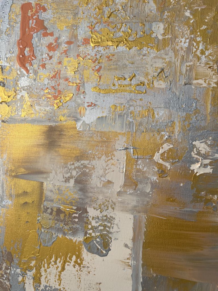 In diesem zeitgenössischen Werk habe ich die zeitlose Schönheit von Gold und Silber eingefangen – es strahlt Wärme und Eleganz aus, als ob es eine Geschichte aus vergangener Zeit erzählt. Gerade die unterschiedlichen Bereiche des Bildes lassen es besonders wirken. Mittig habe ich es großflächig und clean angeordnet, seitlich kam meine spezielle Technik zum tragen, welche es wieder etwas auflockert.