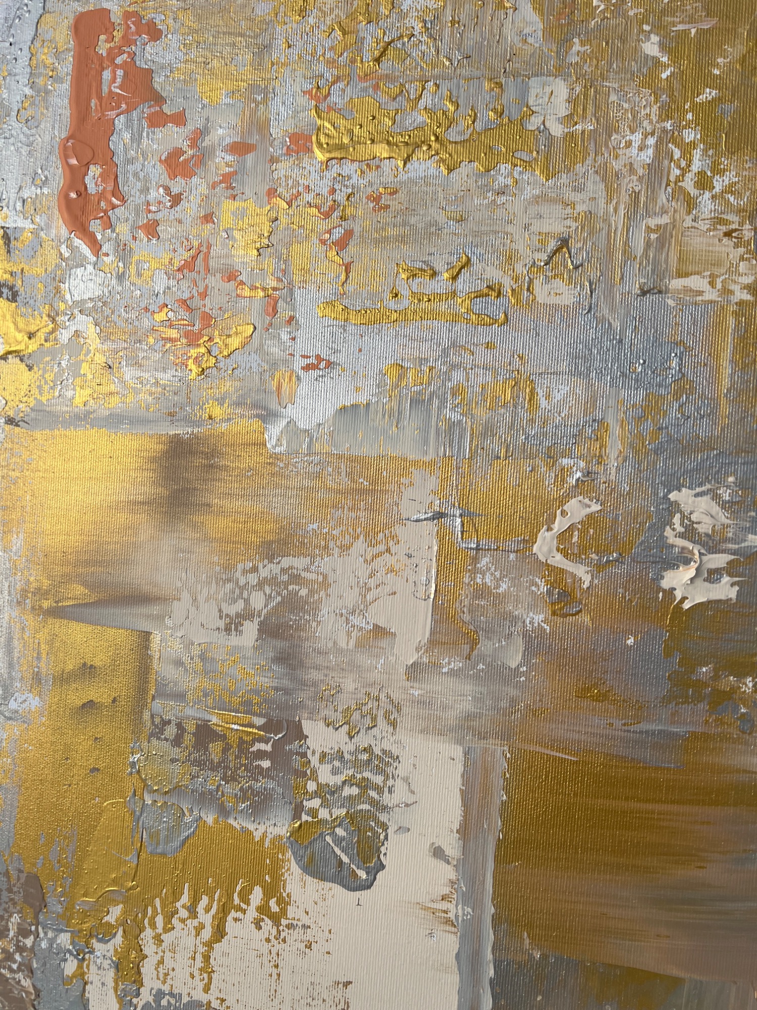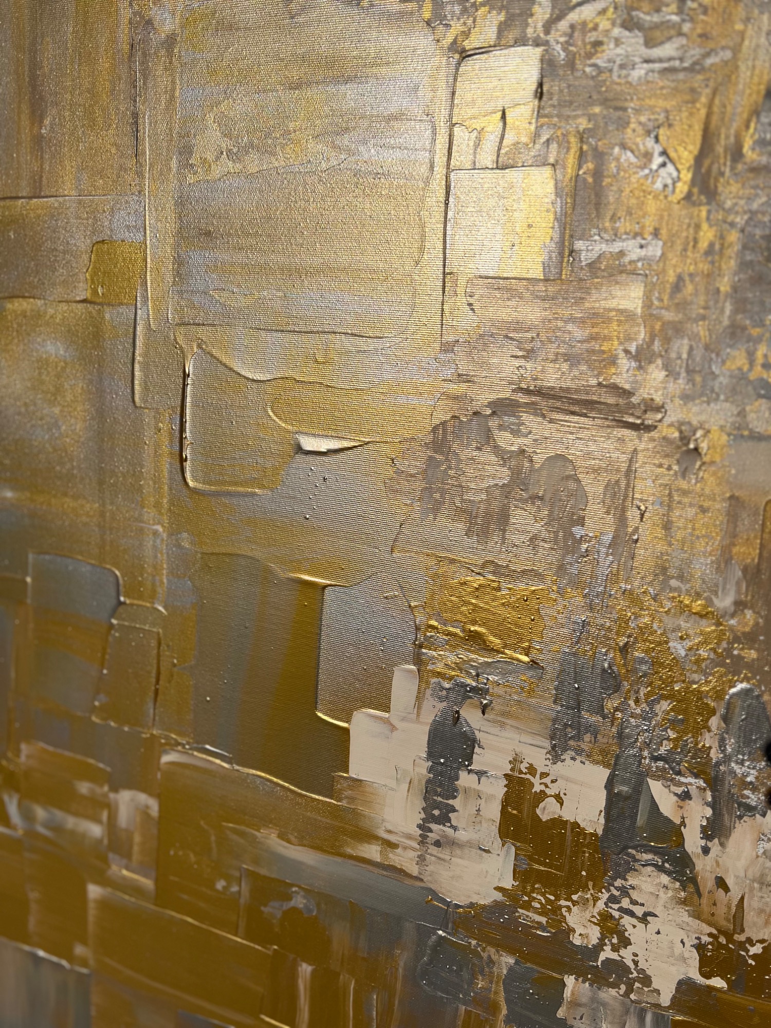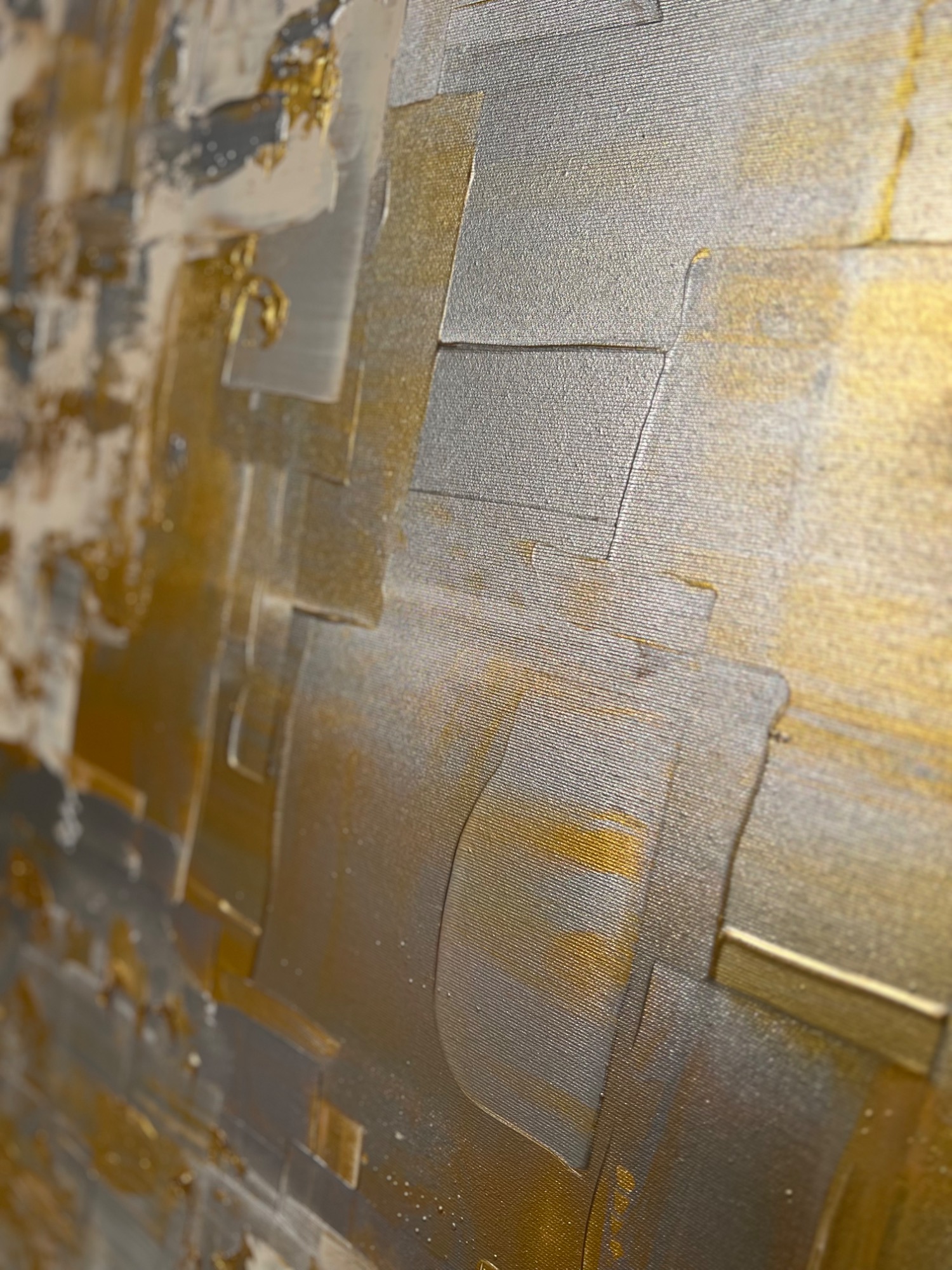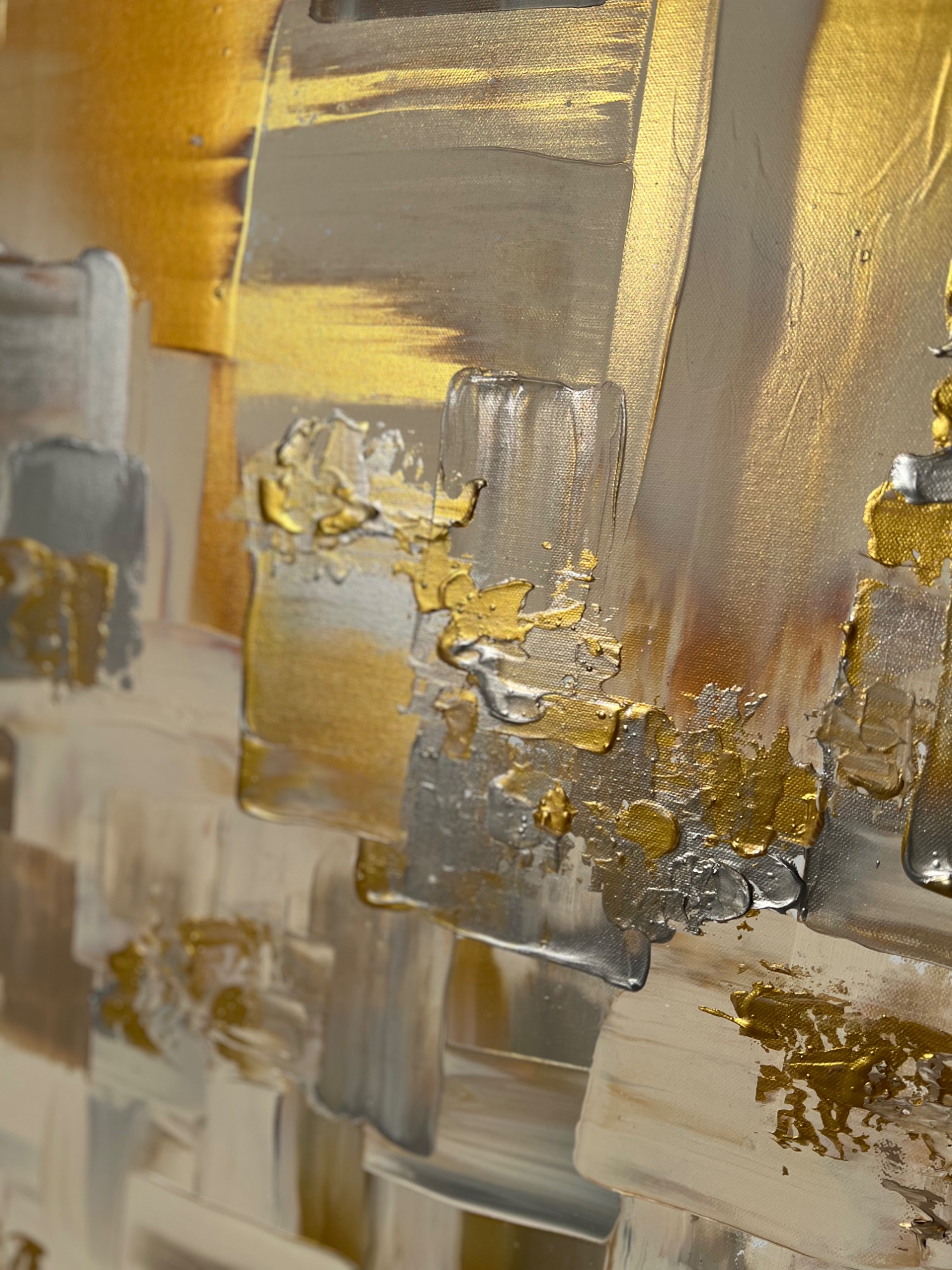 Diese Auftragsarbeit „Yin no. 8" basiert darauf, dass es ein Mix werden sollte - aus Gold, etwas silber, ein paar dunklere Anteile und ganz viel Beige. Ich ergänzte es partiell mit noch mehr Produkt, was es bei diesem Bild besonders wirken lässt.