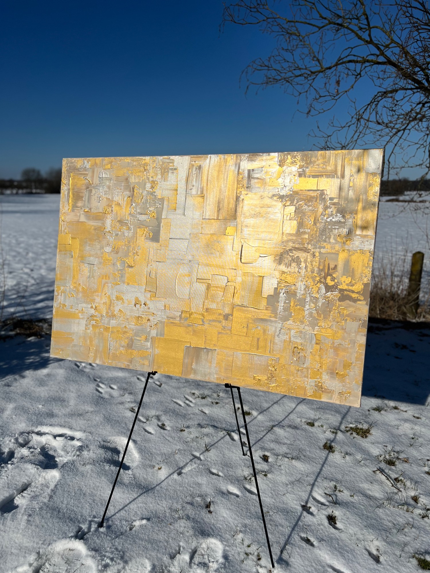 In diesem zeitgenössischen Werk habe ich die zeitlose Schönheit von Gold und Silber eingefangen – es strahlt Wärme und Eleganz aus, als ob es eine Geschichte aus vergangener Zeit erzählt. Gerade die unterschiedlichen Bereiche des Bildes lassen es besonders wirken. Mittig habe ich es großflächig und clean angeordnet, seitlich kam meine spezielle Technik zum tragen, welche es wieder etwas auflockert.