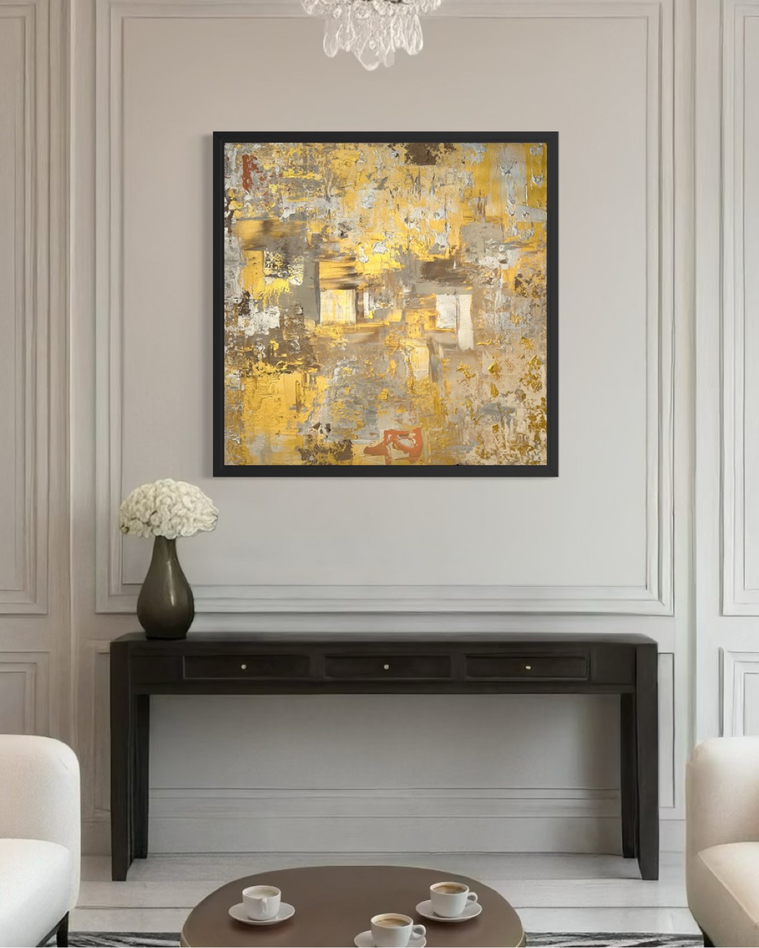 Eine klassisch eingerichtete Umgebung wird zum Resonanzraum für ein kraftvolles abstraktes Werk. Die strenge Geometrie kontrastieren mit der freien, fast eruptiven Malweise des Bildes.
