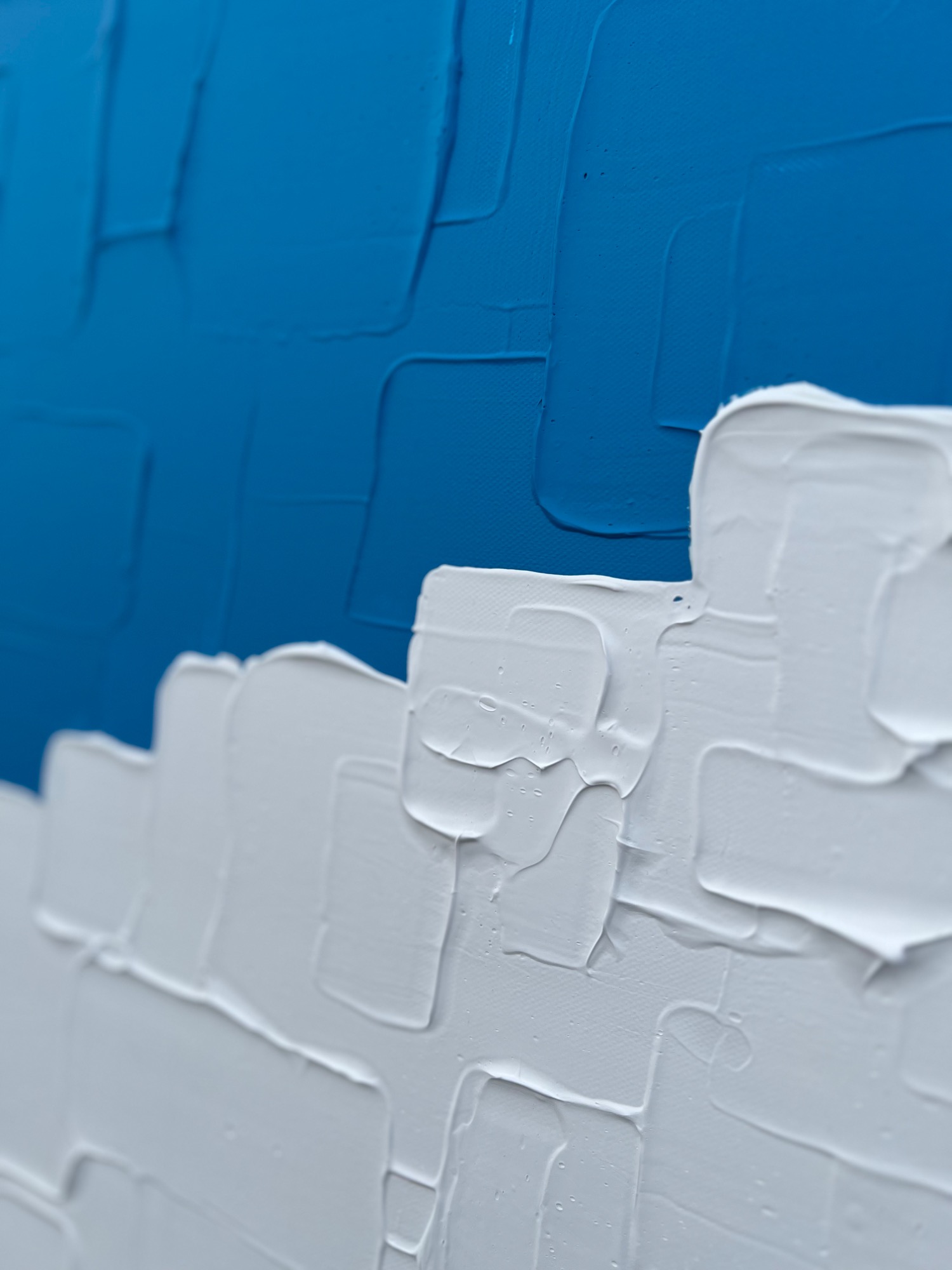 Mit seiner dicken Schicht türkisgrau überlagert es darunterliegende Farbkratzer, welche hervorzustechen versuchen, es ihnen an immer mehr Stellen der Landschaft auch zu gelingen vermag. Ein Glücksgriff für den Betrachter, welcher so, dass im verborgen gelegene genießen kann, -auf 70x70x1,9cm.