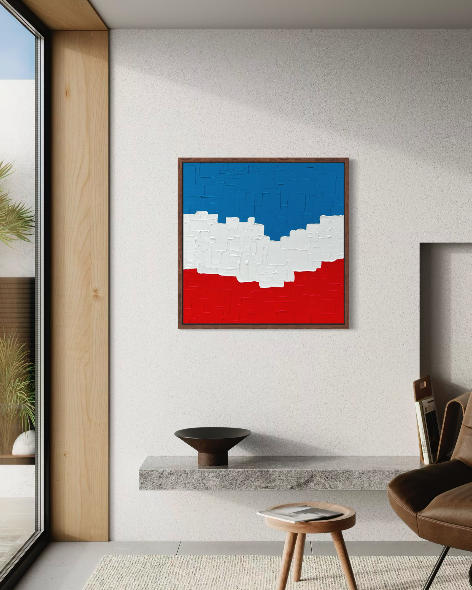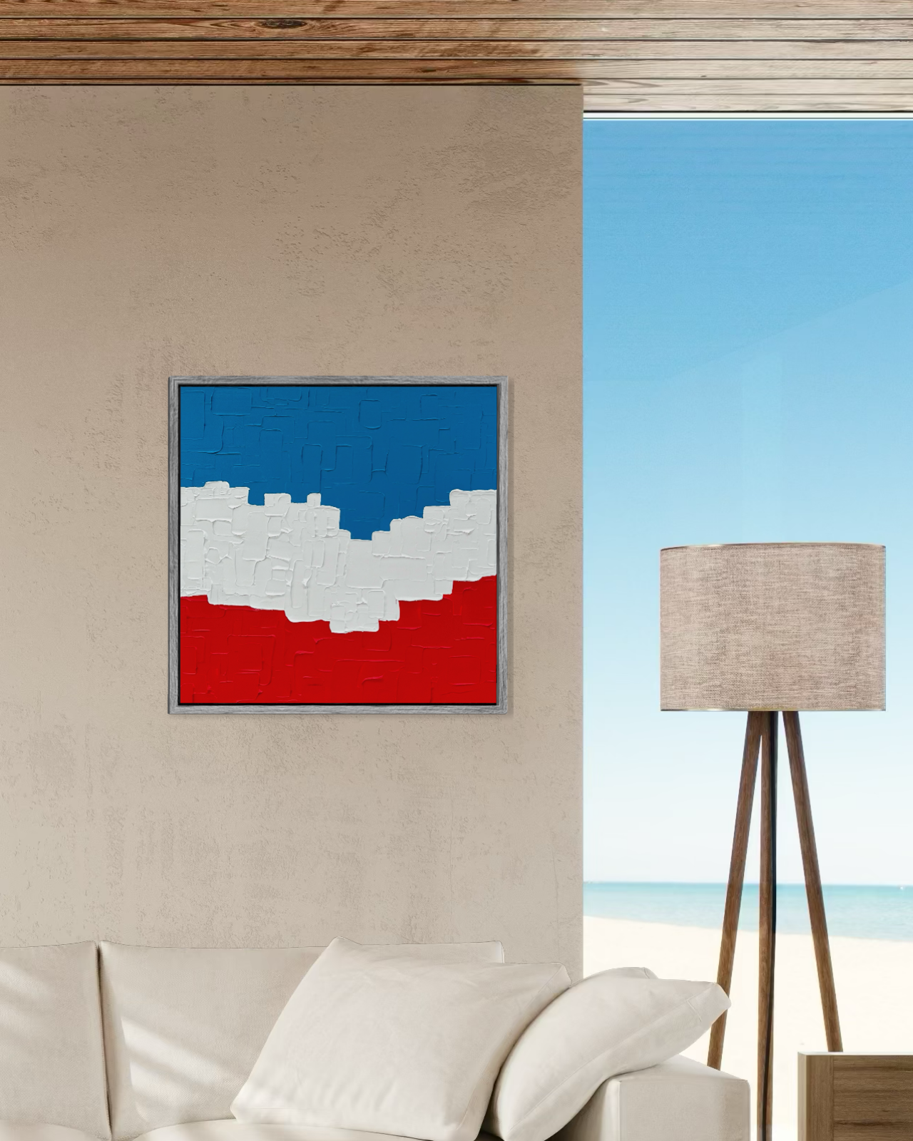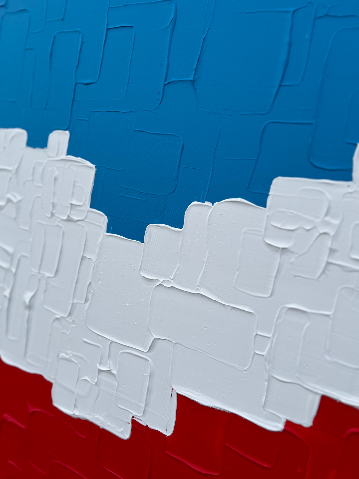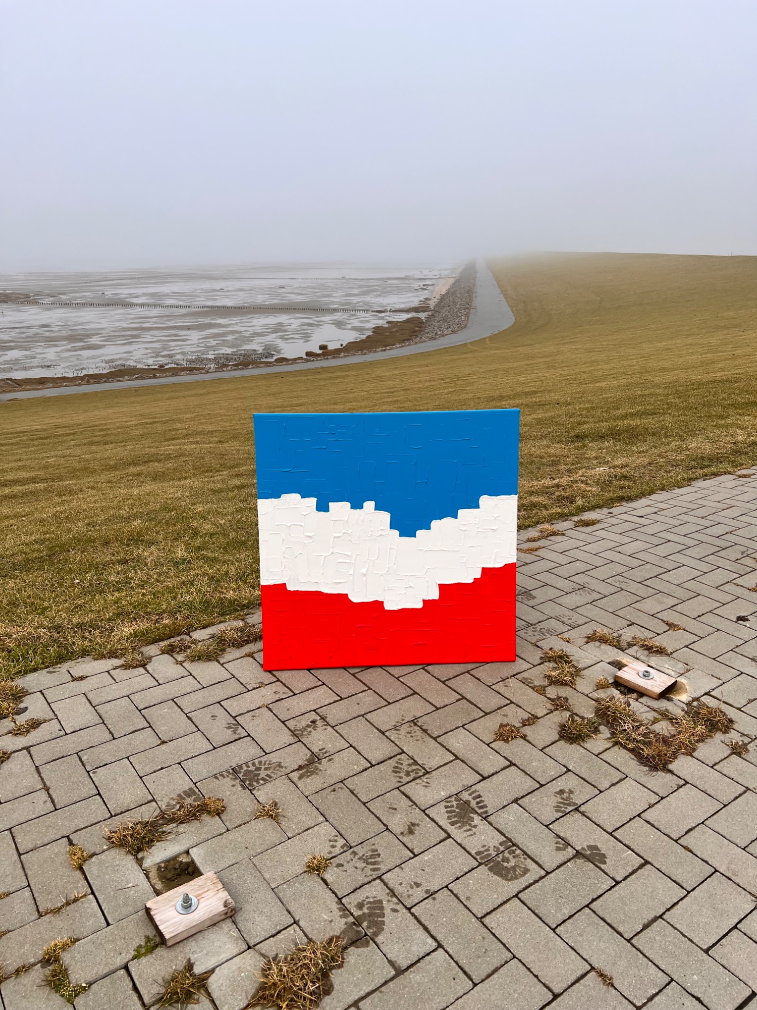 Dieses Werk ist eine Homage an das Bundesland und mein Leben wo ich u.a. aufgewachsen bin und schon als Kind Flaggen hatte. Heute darf ich sie an meinem weißen Holzmast hissen, da ich wieder in diesem und schönsten Bundesland Schleswig-Holstein lebe. Das Acrylbild hat das Maß 80x80x1,8 cm.