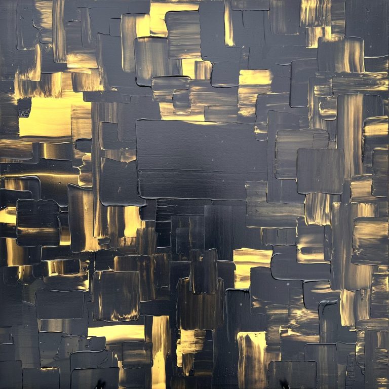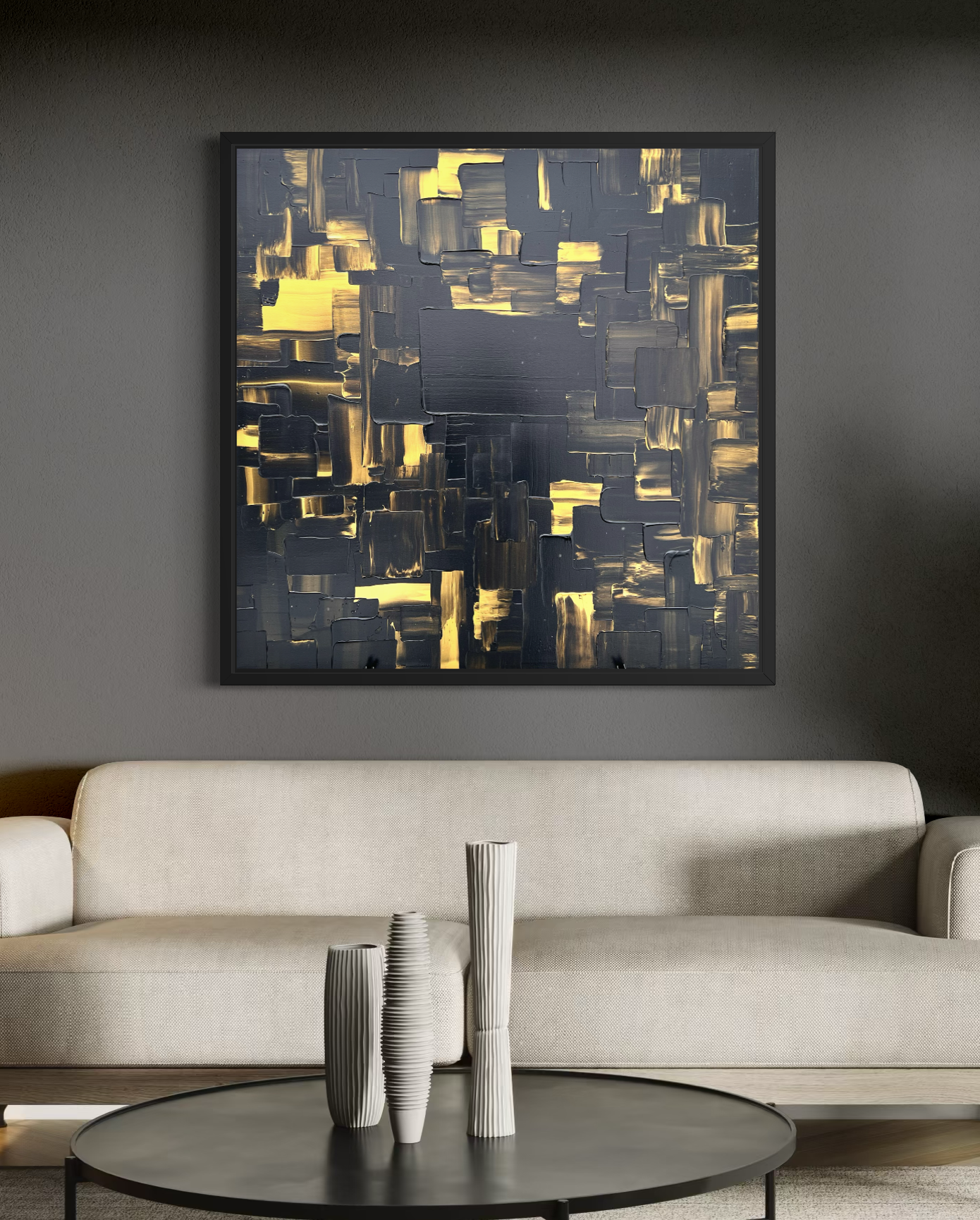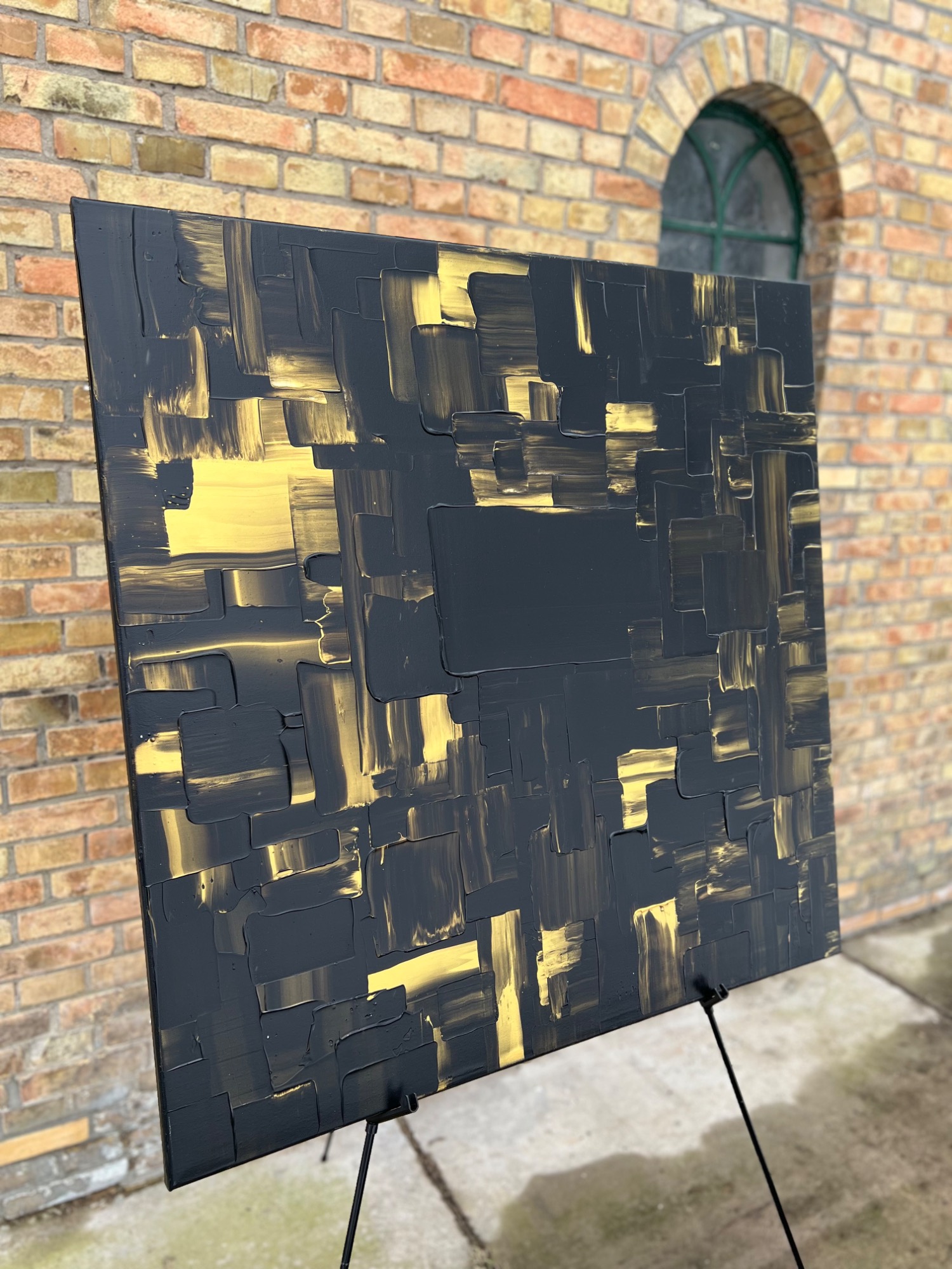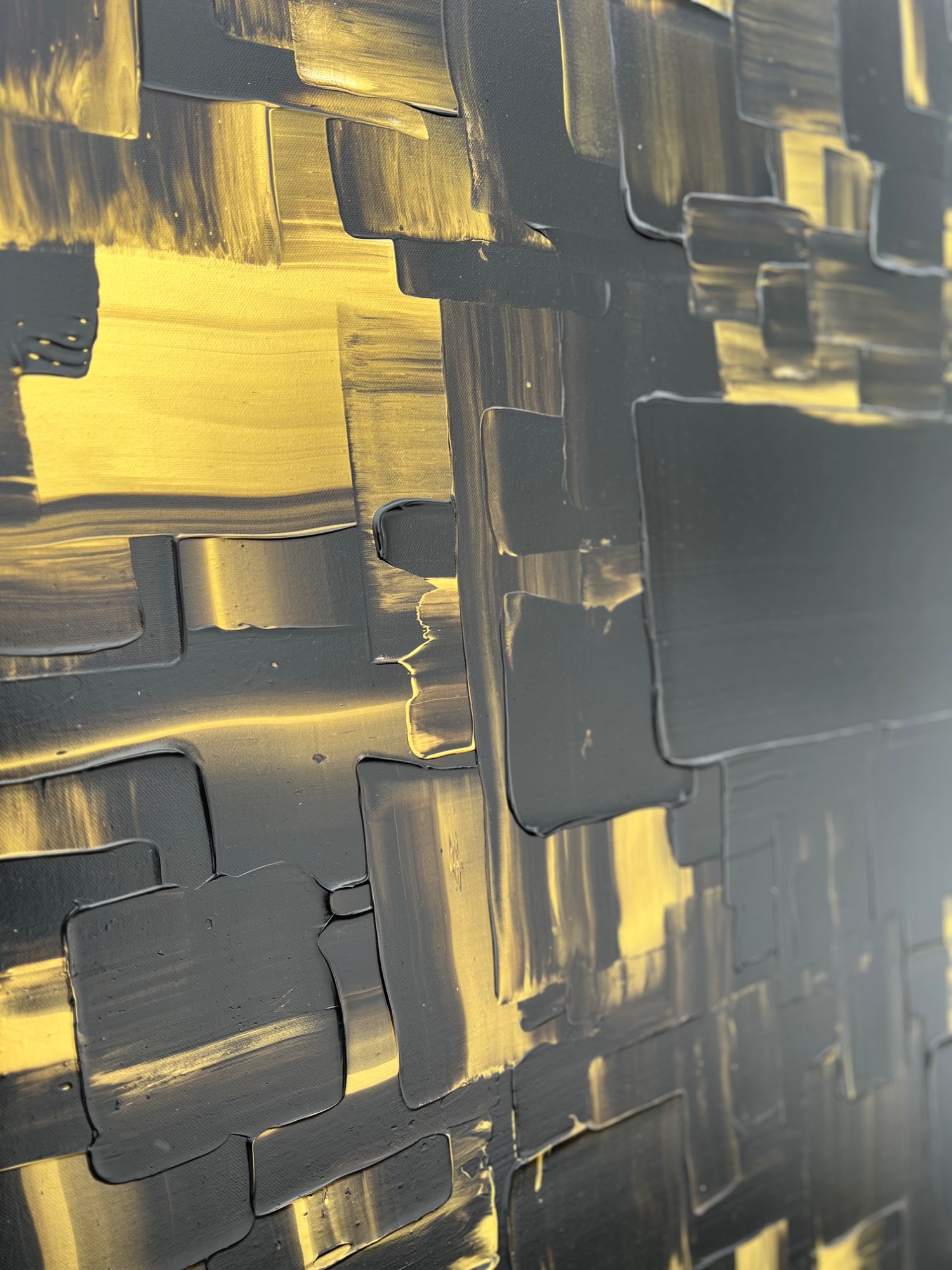 In diesem Werk "Yang no. 4" aus meiner Serie "Schwarzes Gold" habe ich das Zusammenspiel von Dunkelheit und Licht durch abstrakte, geometrische Formen eingefangen. Das schwarze Acryl symbolisiert Tiefe und Geheimnis, während das goldene Leuchten Hoffnung und Energie vermittelt. Ich wollte eine kraftvolle, beinahe surreale Spannung schaffen, die minimalistisch bleibt und dennoch intensiv pulsiert – ein visuelles Erlebnis, das jeden Raum mit mystischer Eleganz erfüllt, -auf 100x100x1,8cm.